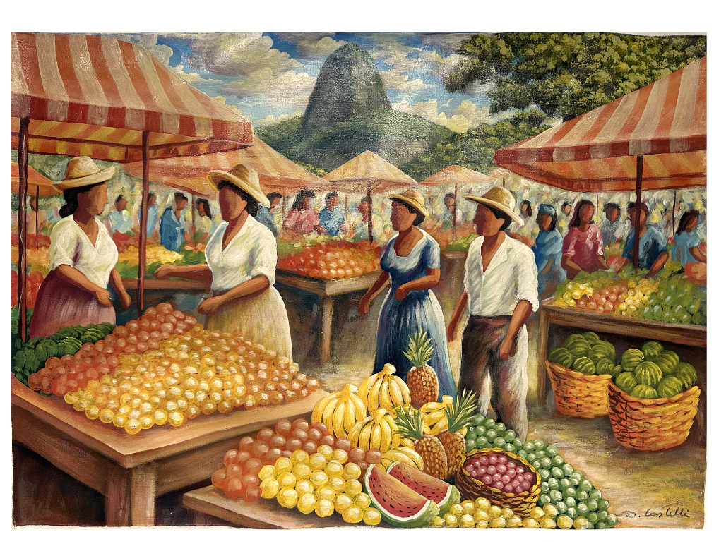 Das Gemälde „Obstmarkt im bunten Rio de Janeiro“ zeigt eine lebendige Marktszene in Rio de Janeiro, mit dem markanten Zuckerhut im Hintergrund, der majestätisch über der Szenerie aufragt. Unter rot-weiß gestreiften Sonnendächern bieten zahlreiche Händlerinnen und Händler ihre Waren an.
